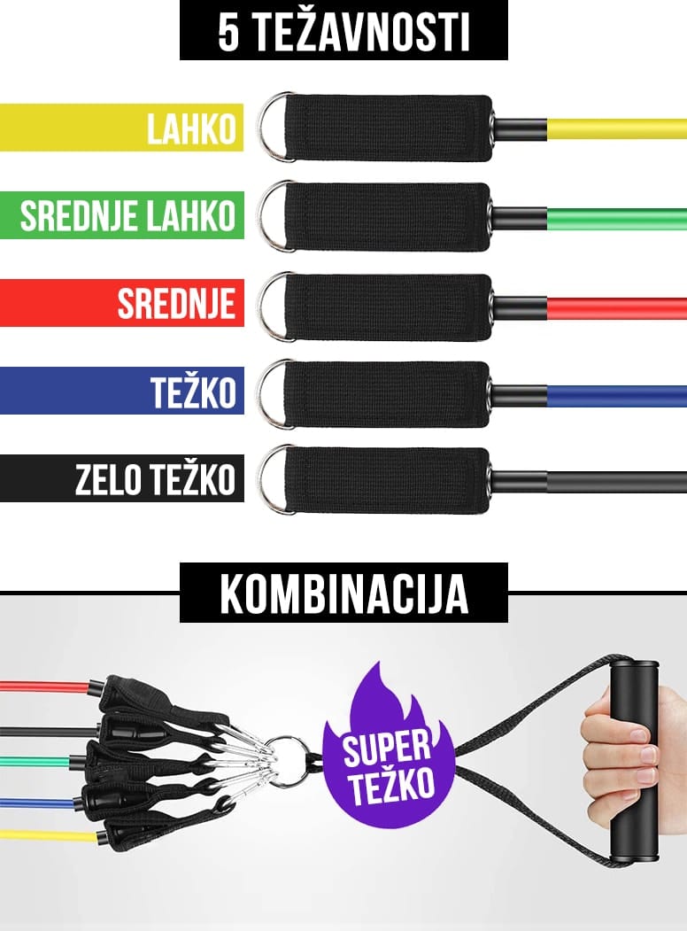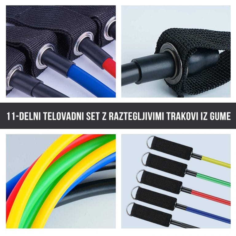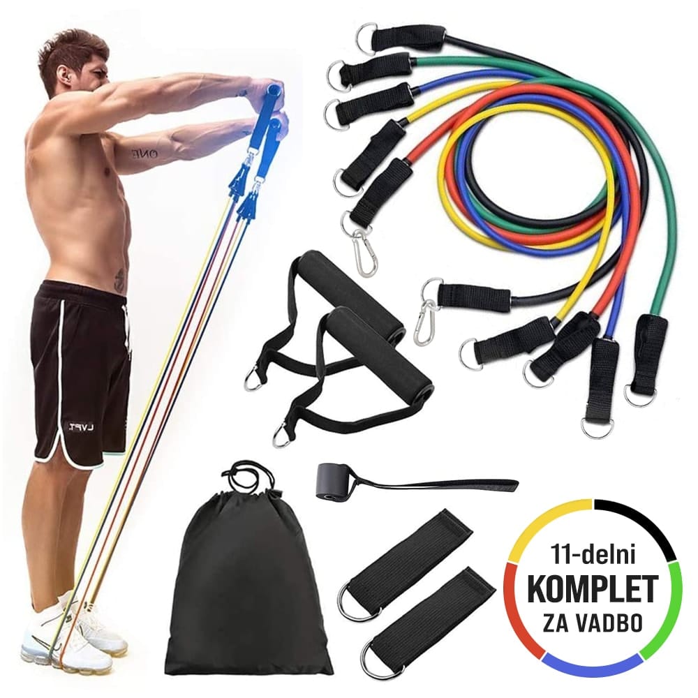 – 11-delni telovadni set z gumijastimi trakovi, ki se razlikujejo po težavnosti