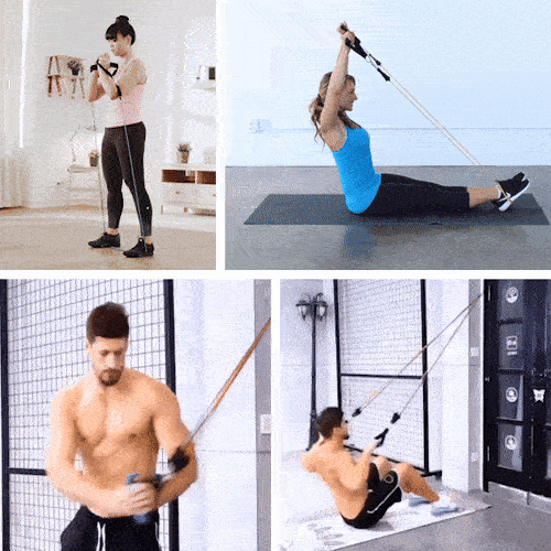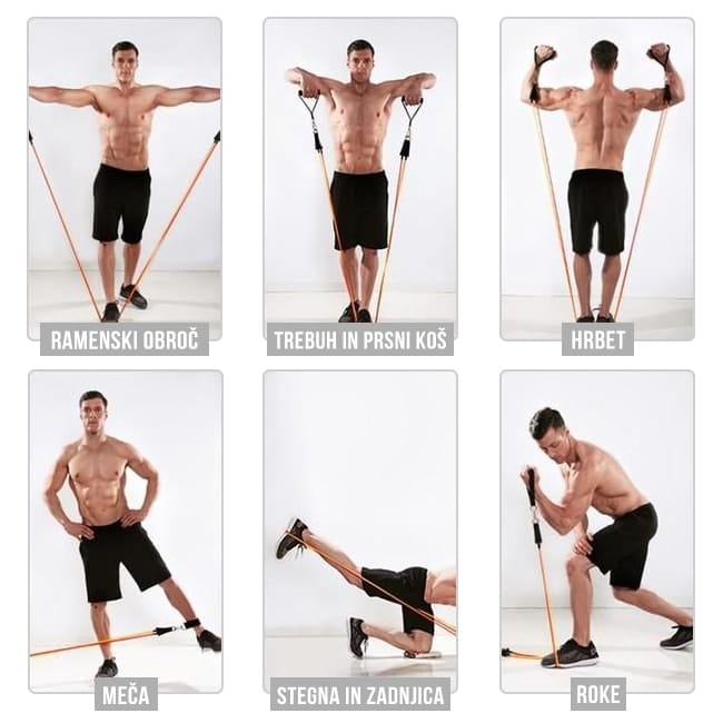S telovadnim setom lahko izvajate širok niz vzdržljivostnih vaj za celo telo in z njim učinkovito okrepite mišice prsnega koša in trebuha, bicepse in tricepse, stegenske in mečne mišice, zadnjico, ramenski obroč in hrbet.