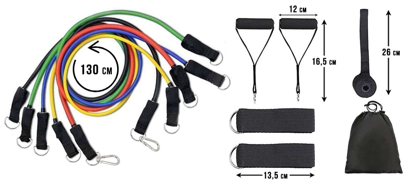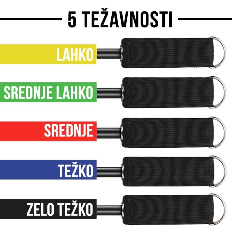 V kompletu prejmete 5 trakov različnih barv, vsaka barva ima svojo težavnost (upornost) – rumena (lahka, do 4,5 kg), zelena (srednje lahka, do 7 kg), rdeča (srednja, do 9 kg), modra (težka, do 11 kg) in črna (zelo težka, do 13,5 kg). Trakove lahko med seboj tudi kombinirate glede na vaše potrebe (upornost skupno do cca. 45 kg).